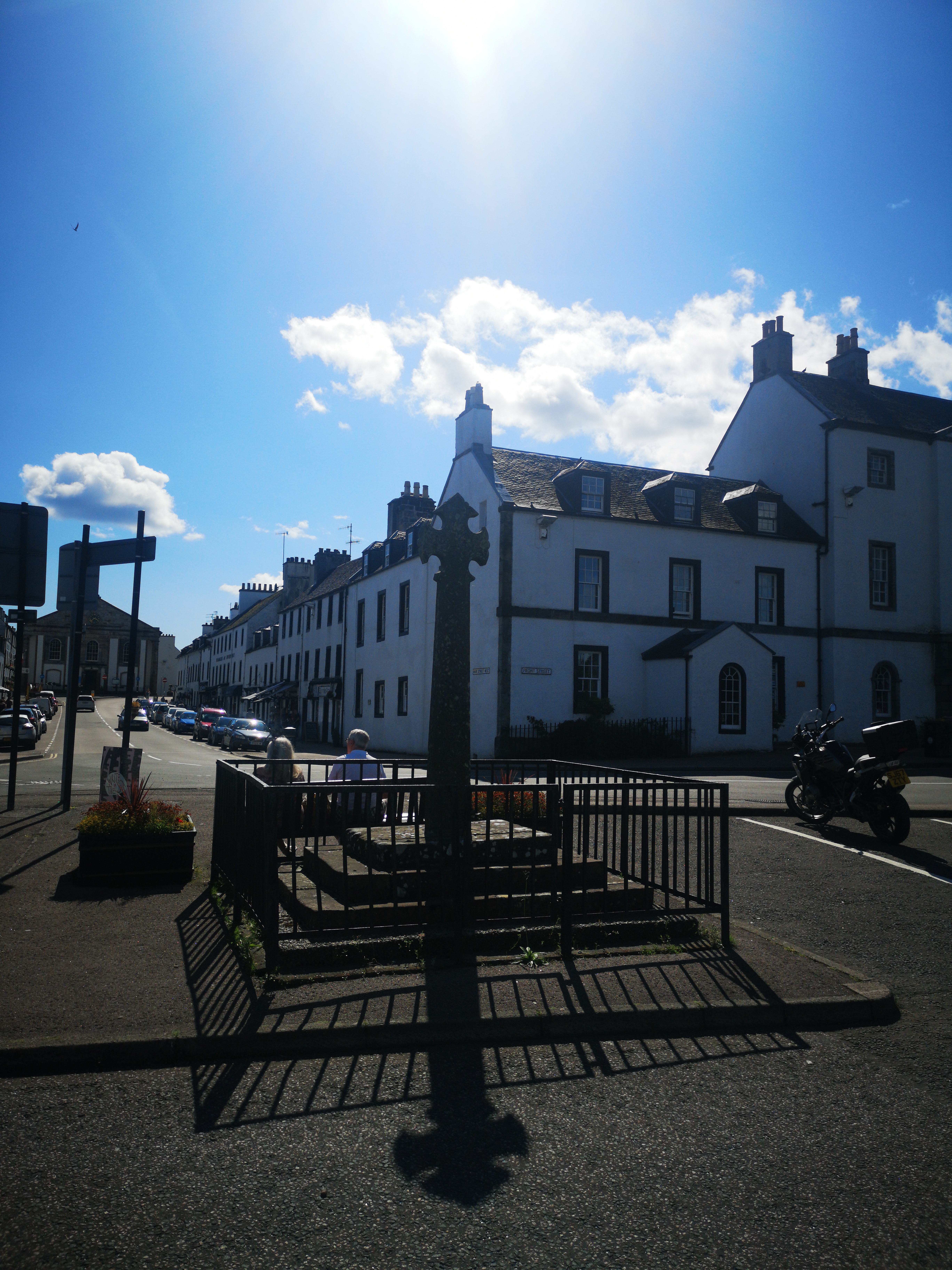 π Although not originally intended as a mercat cross, there is evidence of it being used as one before it was moved. Positioned on a 3 stepped stone base, it is a beautifully carved cross, retaining an incredible portion of its original design. The front facing portion of the cross is well worn and it was hard to identify any of the small carved animals that appear in the second image below.